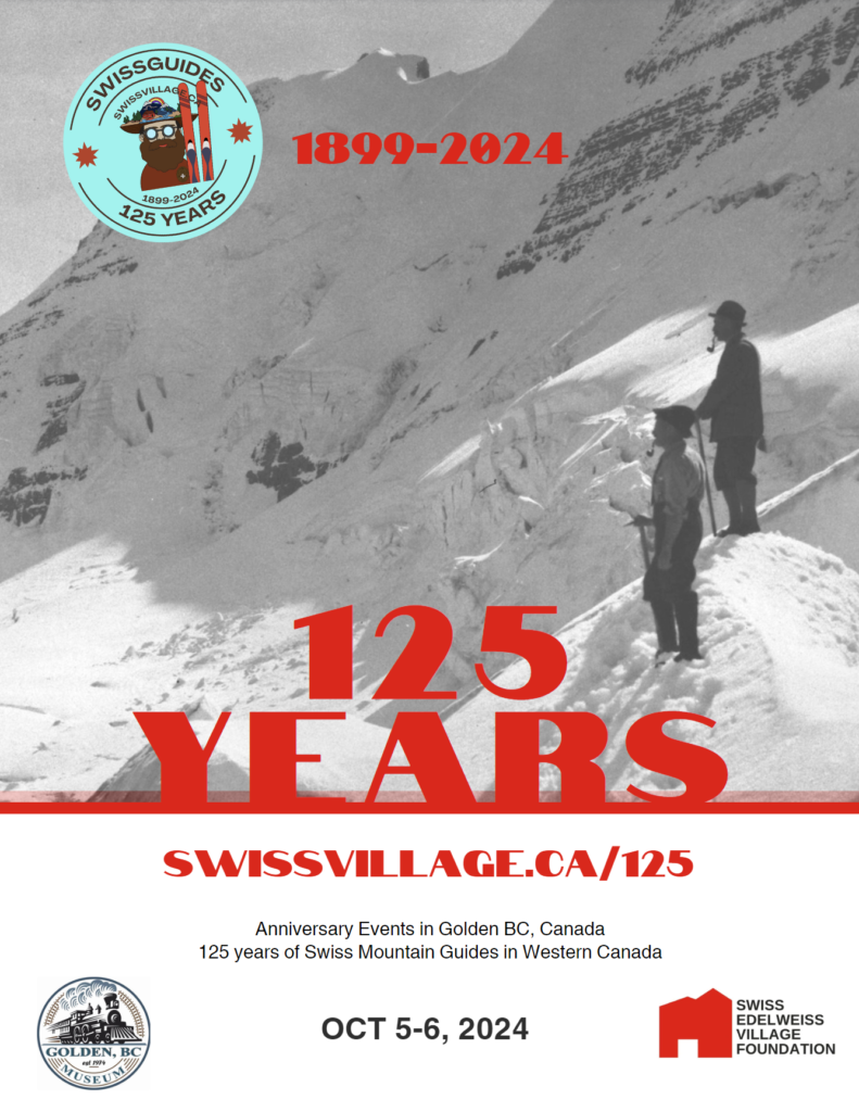 For some members of the ACC community the influence Swiss mountain guides had on mountain culture in Canada is well know. For others, the Swiss impact may be less clear, with a vague thought of Swiss style chalets and ski instruction. I recently had the privilege of attending the 125th Anniversary of Swiss Mountains Guides in Western Canada, an event held in Golden, B.C. and organized by the Swiss Edelweiss Village Association and Golden BC Museum. The weekend included tours of the newly renovated Swiss Edelweiss Village, a commemorative celebration event, and the first ever conference focused on 125 years of Swiss mountain guiding. Although I attended the event as a volunteer, displaying an exhibit from my MA research, I also attended as an ACC member keen on mountain culture and activities.