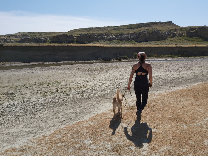 Charlotte and her dog stretching their legs at Upper Kananaskis Lake on Niitsitapi/Stoney/Tsuu T’ina/Michif Piyii/Ktunaxa land