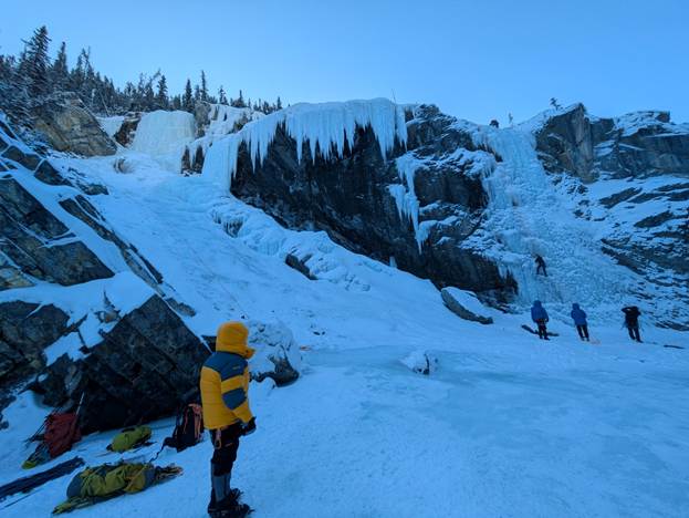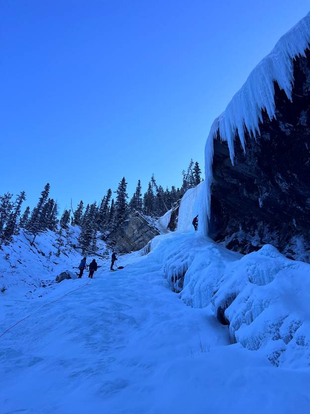 The morning of January 24, 2026, two groups of Edmonton climbers departed the Rampart Creek hostel, one bound for the Balfour wall and the other to Tangle falls. As we were relatively large groups (~10-11 in each), there was some anxiety about getting scooped, especially because we overshot the pre-arranged call time by ~30min. Thankfully, each site was free of people when we rolled up.