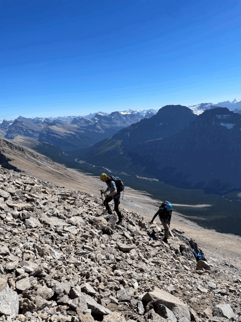 The scrambling itself was gaiter-shredding, foot-bruising, and tiring, with a lot of exposure to rock fall (especially near the false summit) with not much in the way of views. Earlier in the day, we had decided on a turn around time and just 150 meters from the summit we decided to respect that decision.