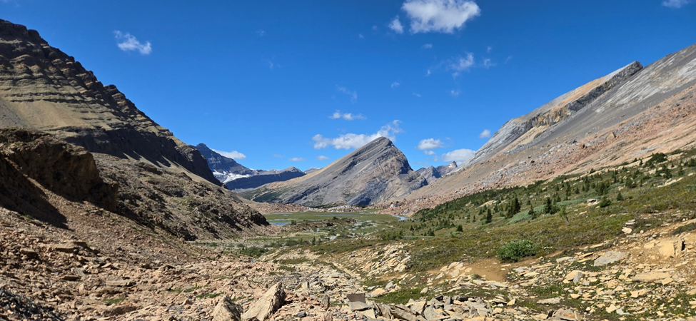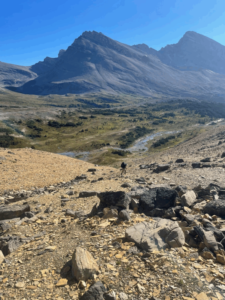 The hike towards the Cataract Creek area was very rewarding. After Nigel Pass, we enjoyed a very serene valley and hike along the Brazeau River, beautiful mountains on either side, rock gardens and boulder hopping on the way and some meadows and green pastures which hosted a herd of sheep on our way out.