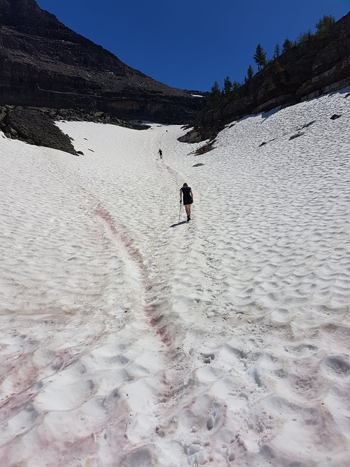An early start on day two set us on our way over Whistling Pass to Scarab Lake and Egypt Lake where we had a short siesta with the obligatory dunk in the lake to cool off the heat-swollen feet. Along the way, we shared the stoke of being in the backcountry with fellow hikers, who didn’t need much convincing to join in on a spontaneous snowball fight to cool off and let go of the mental strains of the last months. Another cloudless day with unforgettable views brought us back to camp via Pharaoh Creek. Tonight’s dinner featured dehydrated bean and lentil stew with tropical cheesecake for dessert. Satisfied with the days past we again quickly hid from the swarming mosquitos to get sleep and be well-rested for the hike out the next day.